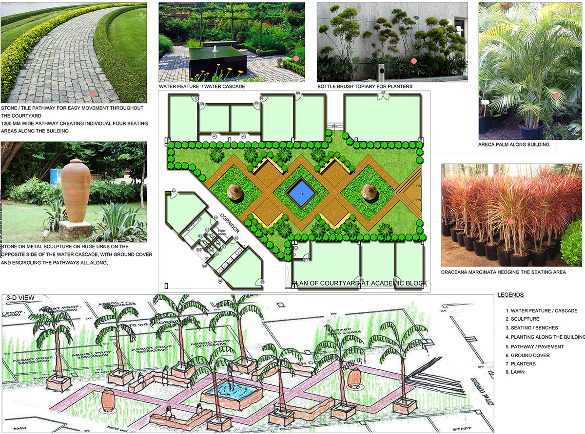 To display this, we have concentrated on a very formal approach right from the main entrance till we reach up to the Administration block encircled by Library and Academic block. Every element is very geometrical placed with sharp edged design elements, thus imparting a sense of formal and organised approach. Strikingly, at semi formal areas, our theme adapts a lenient approach with few edges and thus makes one feel transition from highly formal to semi formal spaces where the scholars can loiter around, have group discussions and can have general meeting or seminars as part of the system. Finally, at residential areas, design theme again adapts a very open theme. Design allows a person to open up and feel free to jog or sit around, allows kids to play nearby and thus do not restrict anyone to follow a sequence or schedule. This is imparted by adding lots of curvilinear and circular shapes with casual seating under a tree etc.